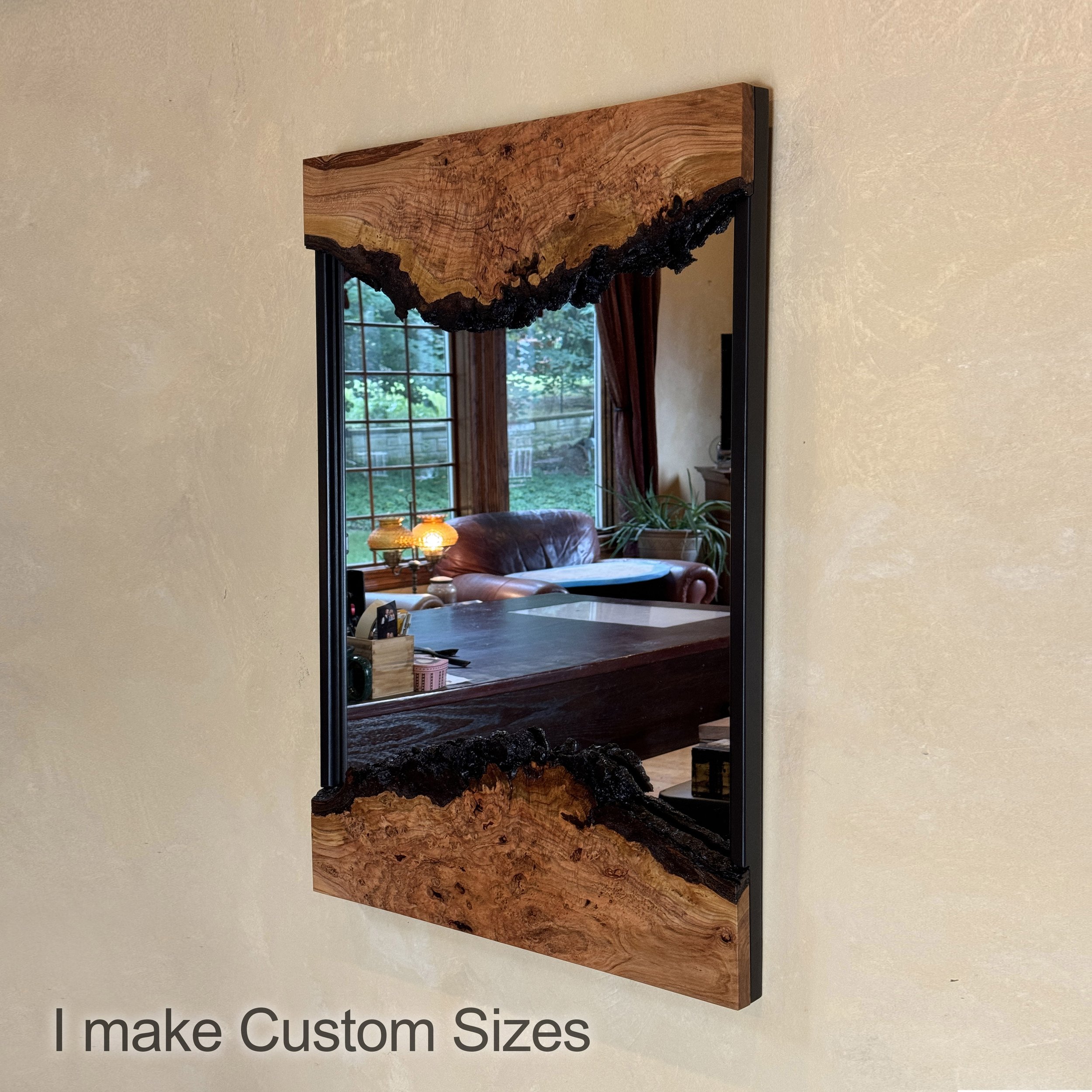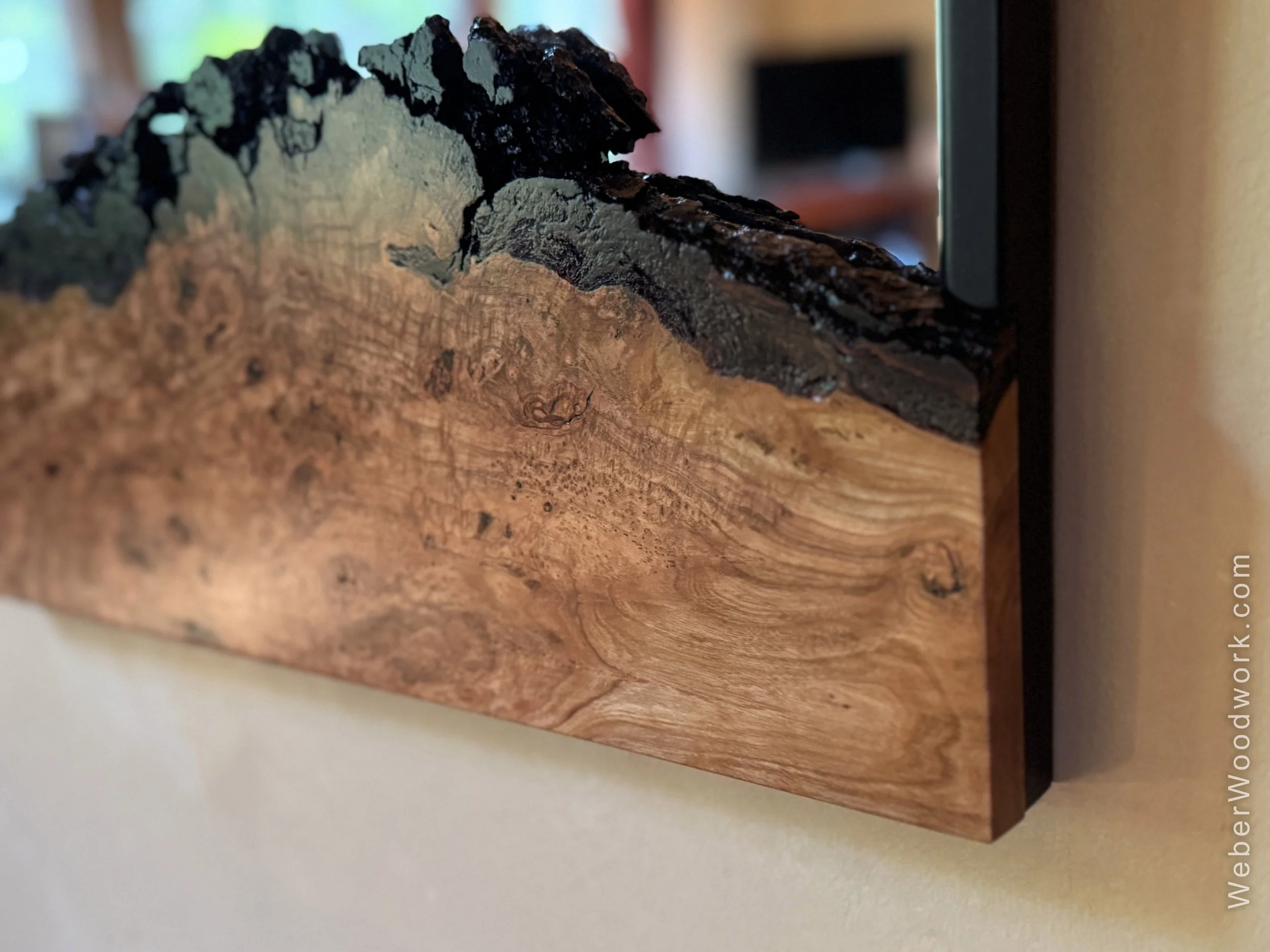 Custom-made Furniture and Décor, Weber Woodwork, Wood framed mirror, live edge mirror wall hanging, Burl, wood art, custom mirror, live edge mirror, Burl Mirror, Interior Designer, marketplace, Art, Handmade, wall art, Artist, cherry burl, Weber Design, Artisan, woodworker, wood artist, makers, gallery, commission, furnishing, custom woodwork, Bathroom Mirror, Bedroom mirror, Hallway mirror, Entryway mirror
